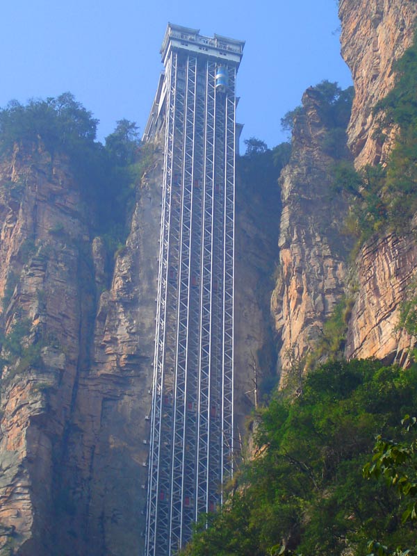 百龍?zhí)焯?BR>    百龍?zhí)焯,垂直高?35米,運行高度326米,由154米山體內(nèi)堅井和172米貼山鋼結(jié)構(gòu)井架等組成,采用三臺雙層全暴露觀光電梯并列分體運行,每臺次載客50人次,運行速度3米/秒,三臺同時運行每小時往返量達4000人次。百龍?zhí)焯莸男藿▽崿F(xiàn)“山上游,山下住”的目標,提供了交通保障,將袁家界天下第一橋、迷魂臺、天懸白練以及烏龍寨、楊家界等絕世美景從幕后推向了前臺,并將天子山、袁家界、金鞭溪等精品旅游線路連為一體,解決了多年困擾景區(qū)的交通瓶頸問題。
