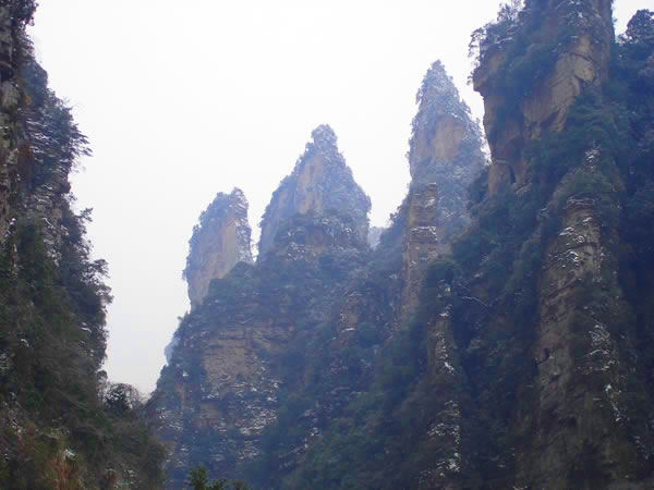 百丈峽圖片 凡到過索溪峪的人,都知道黃龍洞和寶峰湖,卻不一定知道那里還有個百丈峽。一個十分野氣的地方。是的 一級級不規(guī)則的坡田,傍著不被人注意的小山。山腳下蜿蜒一條溪流,幾乎看不到水。只憑一些雜亂的卵石才能辨認(rèn)出來。那溪流的出山之處,便是百丈峽口。幾條既是田埂又兼小路的窄徑,將我引到峽口。!一下子眼界大開,驚喜得叫了一聲。好偉麗的山,好嵯峨的峰!縱目觀去,不遠(yuǎn)的峽正中,一峰拔地豎起,似一條巨大的桿魚,頭在半空,尾藏溪中,蔚為壯觀,一下子便吸引了我。